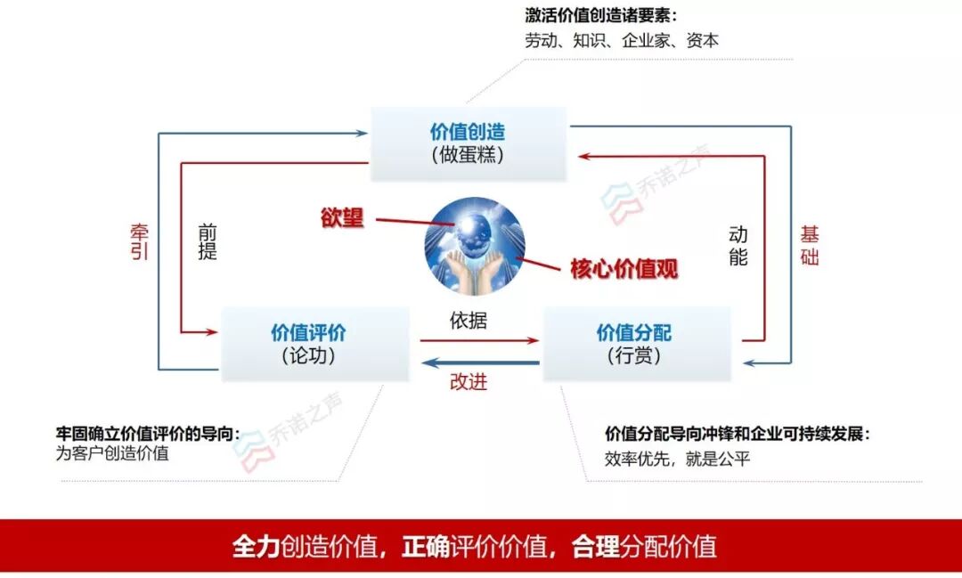 华为公司坚持以价值创造为基础的利益牵引机制,通过价值创造、价值评价和价值分配,保证奋斗者的利益、激励奋斗者持续创造价值,形成良性循环。