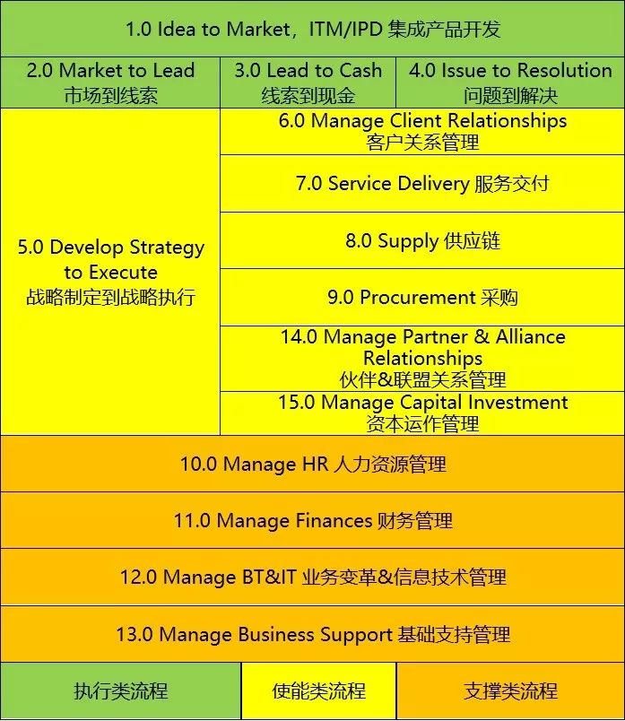 使能类流程响应执行类流程的要求,支撑执行类流程创造客户价值,包括战略制定到战略执行、客户关系管理、服务交付、供应链、采购、伙伴&联盟关系管理、资本运作管理等7个流程;